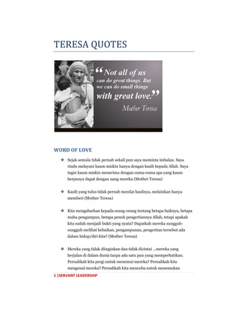 That Mother was a natural leader comes out from this quote of hers. Describe Mother Teresas leadership approach from your observations of the Mother Teresa. Servant Leadership Outcomes.
